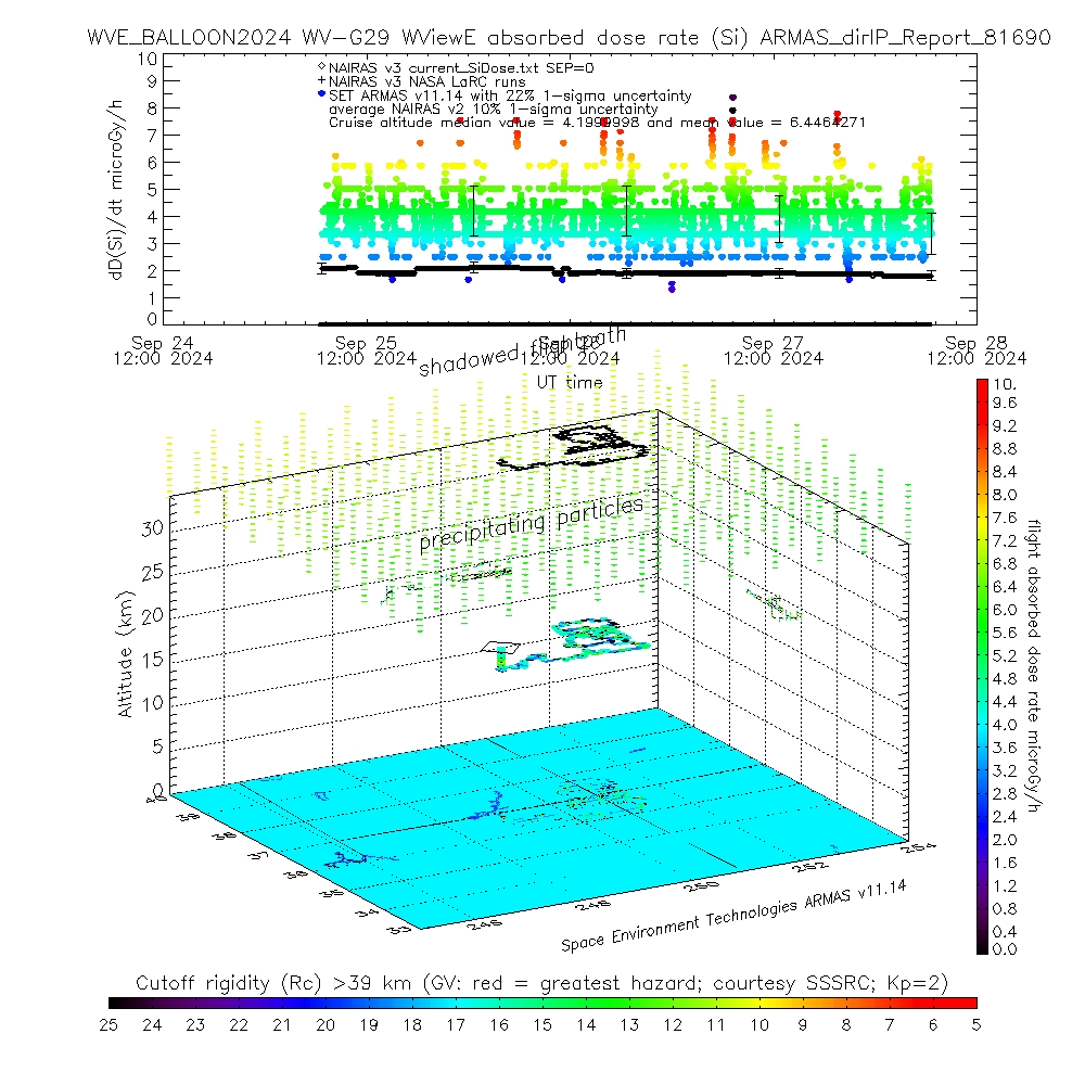 The accompanying figures depict the final days of the flight, illustrating high and variable dose rates in silicon (colored dots) exceeding the galactic cosmic ray background (black dots). The flight path for the day preceding descent is depicted in the bottom panel.