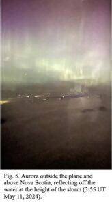 A photo taken from the plane’s exit door window during the height of the storm, when the flight was south of Nova Scotia (lights visible) at 10 km (36,000 ft), is shown in Figure 5. Tobiska noted, “the seasoned pilots, one of whom lives in Alaska, told me after the flight that it was the most intense auroral display he has ever seen during a flight. He showed me his personal pictures of brilliant streaming corona aurora directly over the plane that was taken from the cockpit window.”