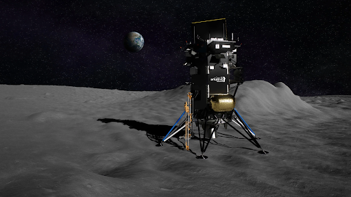 Caption: Illustration of Intuitive Machines’ Nova-C lander with a depiction of NASA’s the Polar Resources Ice-Mining Experiment-1 attached to the spacecraft on the surface of the Moon. Credit: Intuitive Machines